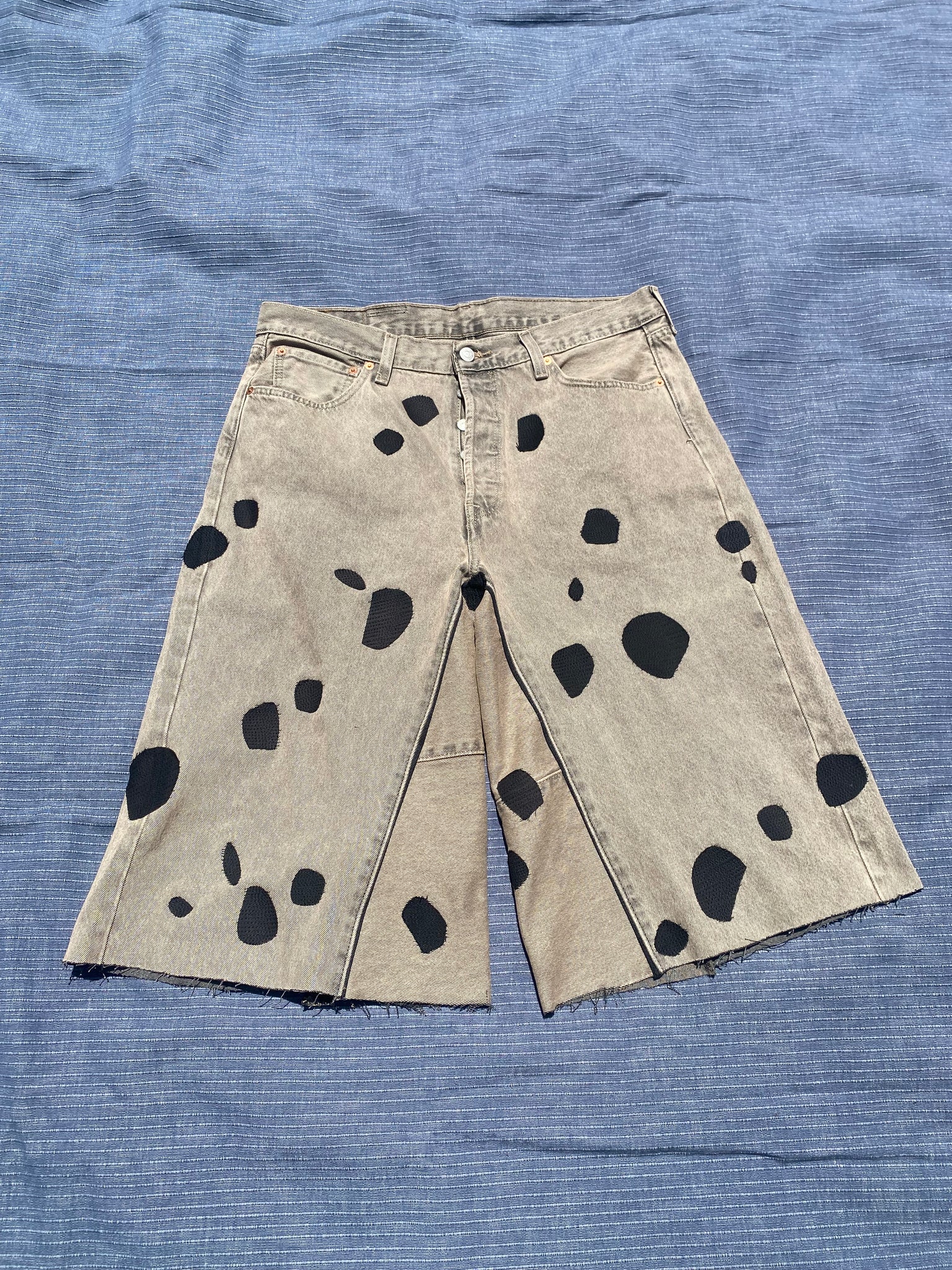 a good amount of black patchwork spots straight stitched onto baggy denim jorts